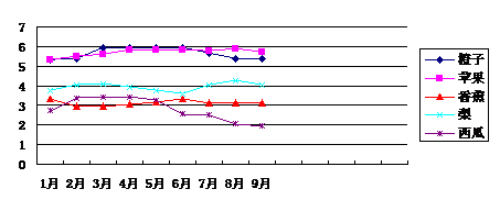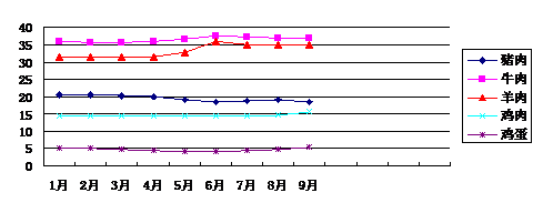 随着秋季来临,10月份应该出现气温的明显降低,利于蔬菜生长及保存,特别是本地绿叶菜供应量应会增加,因此预计蔬菜价格将下跌。猪肉供需与9月相比变化不大,因此预计价格保持平稳,而牛羊肉需求会有所上升,因此预计价格会有所上涨。10月份由于中秋节已过,鸡蛋的需求量大幅降低,因此预计价格将下跌。10月份海产类禁渔期基本结束,加上淡水鱼供应充足,因此预计水产类价格稳中有降。10月初由于节日效应需求上升,但是秋季水果供应增加,特别我们监测的为常规水果,节日效应体现不会很明显,因此预计监测品种水果价格整体维稳,小幅下跌。