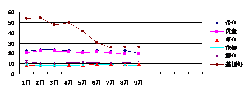 带鱼价格为20.11元/斤,环比下跌9.46%。黄鱼价格为19.4元/斤,环比上涨1.41%。草鱼价格为9.65元/斤,环比上涨3.65%。花鲢价格为8.17元/斤,环比下跌6.09%。鲫鱼价格为11.76元/斤,环比上涨7.1%。基围虾价格为26.17元/斤,环比下跌0.34%。
